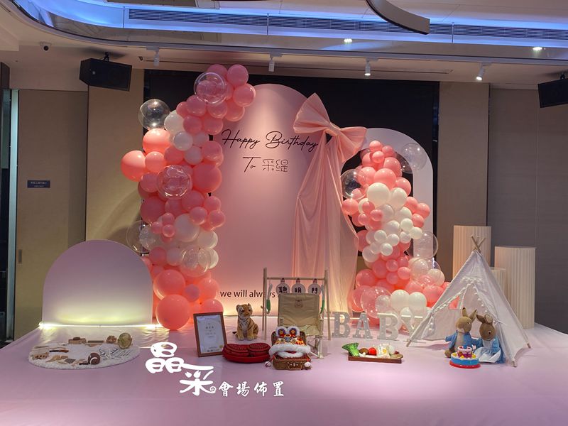 抓周佈置:可愛抓周主題氣球、舞台背板、拍照區,紀錄寶寶人生第一個重要里程碑。